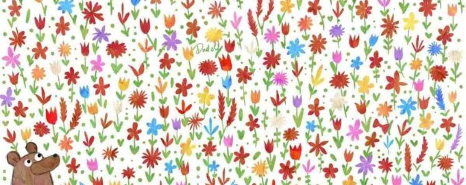Medveď hľadá svojho motýlika v záhrade plnej kvetov a listov. Úlohou je nájsť ukrytý motýlik na obrázku do 5 sekúnd. Kľúčom je nepustiť sa do chaotického