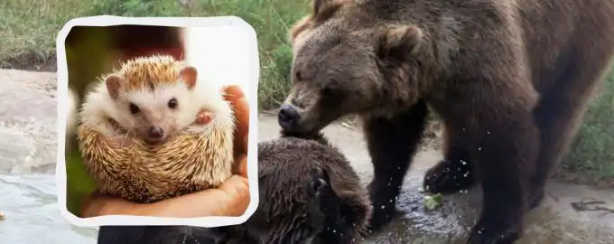 Na tejto fotografii s dvoma medveďmi sa v tráve dokonale zamaskoval malý ježko. Nájsť ho je skutočná výzva pre pozornosť, pretože jeho sfarbenie dokonale