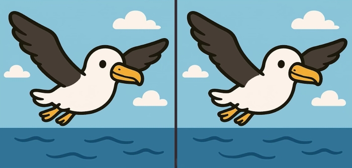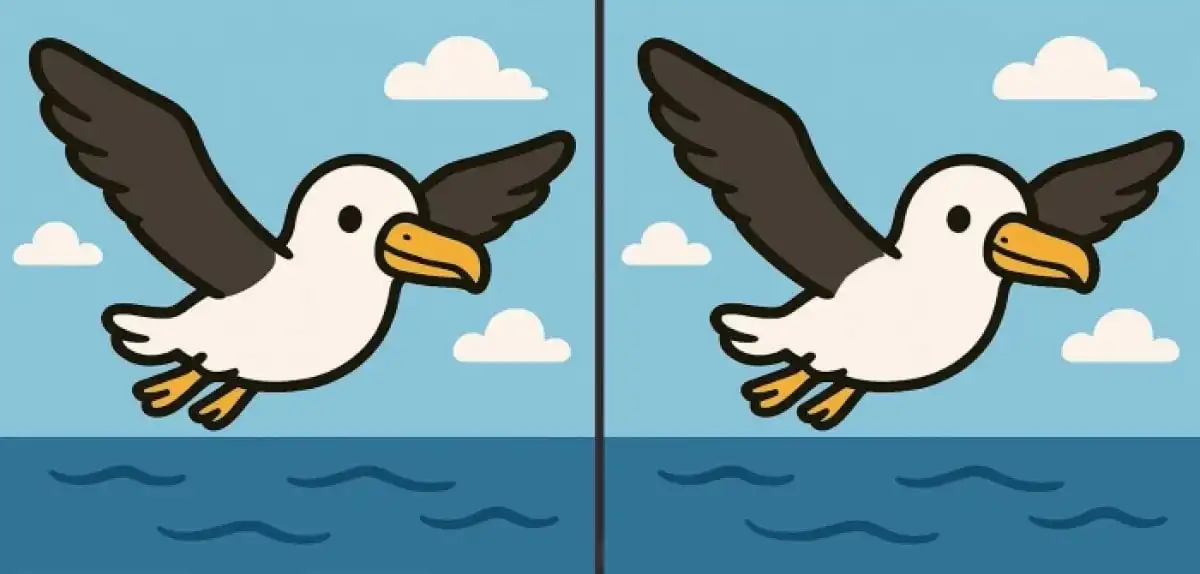 Dva takmer identické obrázky letiaceho vtáka nad vodou skrývajú tri jemné rozdiely. Dokážete ich všetky odhaliť za 31 sekúnd? Kľúčom je systematické skenovanie obrazu po sekciách.