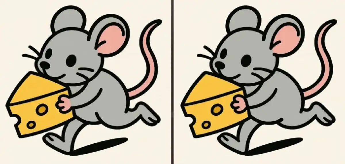 Dve zdanlivo identické myši sýrom skrývajú tri jemné rozdiely. Dokážete ich všetky odhaliť za 31 sekúnd? Kľúčom je systematické skenovanie obrazu po sekciách a pozornosť k detailom, ako sú chvost, uši a samotný sýr.