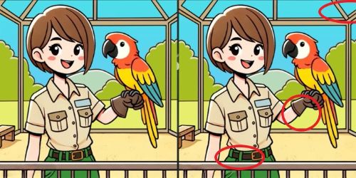 Dve takmer identické scény s dievčaťom a papagájom skrývajú tri jemné rozdiely. Dokážete ich všetky nájsť za 17 sekúnd? Kľúčom je systematické skenovanie obrazu po sekciách a pozornosť k detailom ako sú farba, tvar a poloha.
