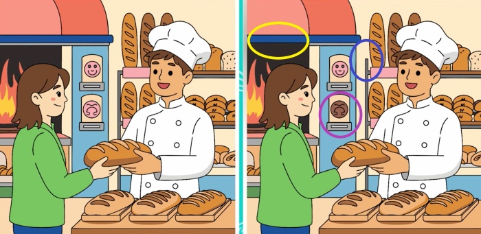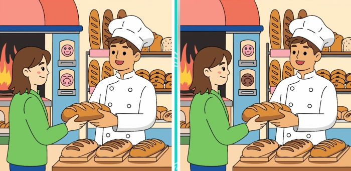 Predstavte si, že ste kontrolór kvality v malej pekárni. Váš úkol je preskúmať dve fotografie z výroby, ktoré by mali byť totožné. Avšak niekto počas procesu urobil tri chyby. Dokážete ich odhaliť skôr, ako sa šarža chleba dostane k zákazníkom? Váš časový limit je 25 sekúnd. Pozorne si prezrite obrázok nižšie a pokúste sa nájsť všetky tri nezrovnalosti.