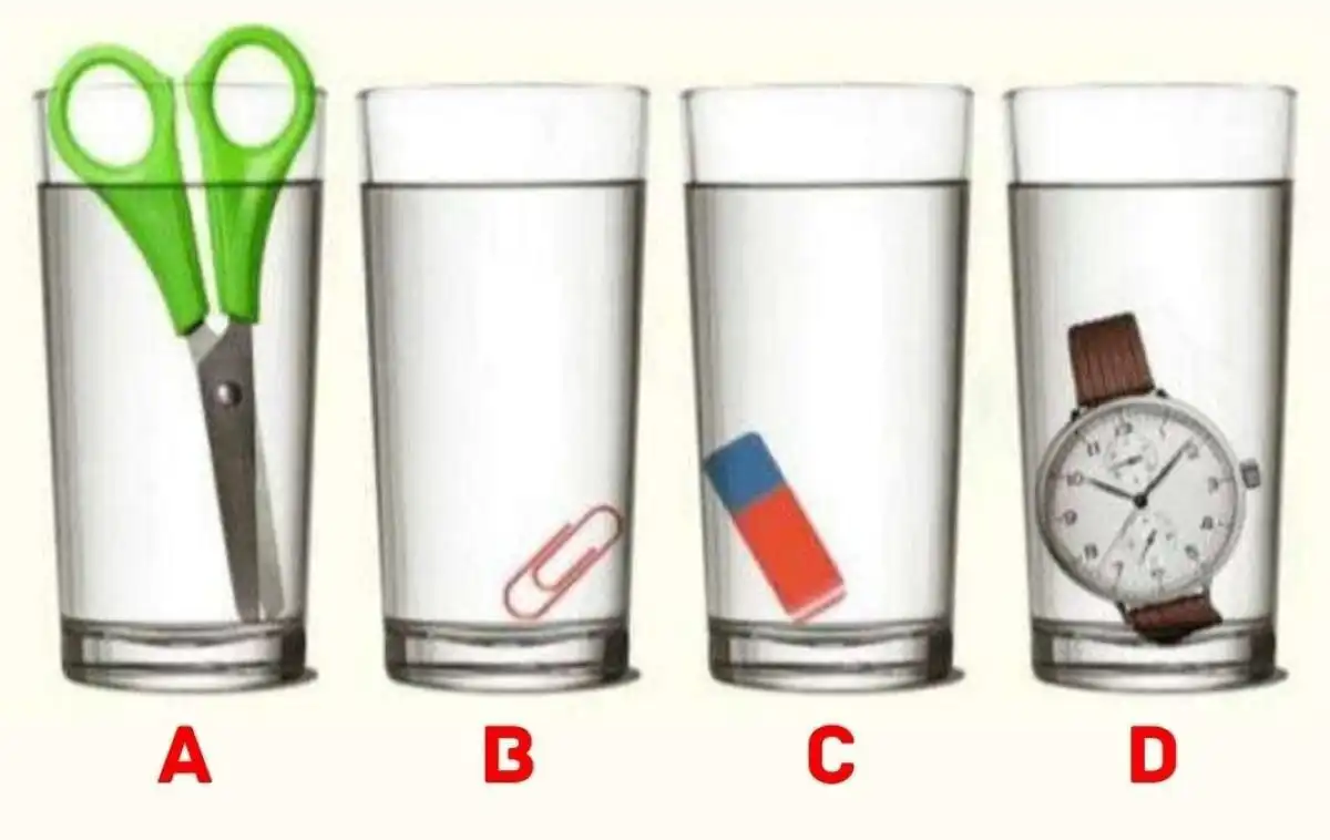 Táto vizuálna hádanka testuje vaše chápanie objemu a priestoru. Na obrázku sú štyri poháre s vodou, v každom je iný predmet. Kľúčom k riešeniu nie je počet predmetov, ale to, koľko miesta zaberajú v pohári.