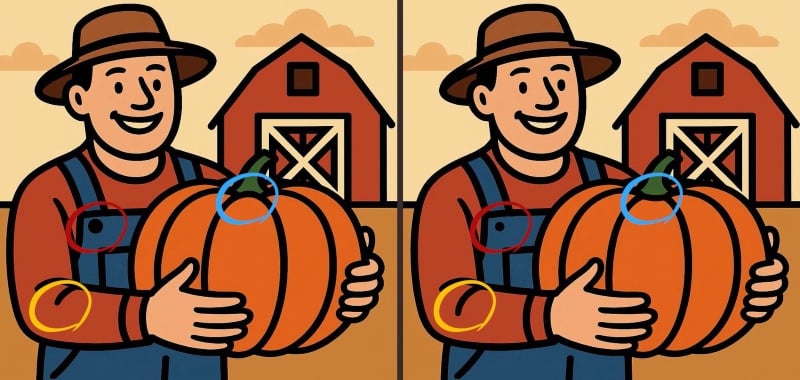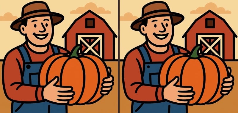 Táto hádanka testuje vašu pozornosť do detailov: na dvoch takmer identických obrázkoch farmára s tekvicou sa skrývajú tri jemné rozdiely. Kľúčom k úspechu je systematické skenovanie obrazu po sekciách a nepoddanie sa ilúzii, že „je to všetko rovnaké“.