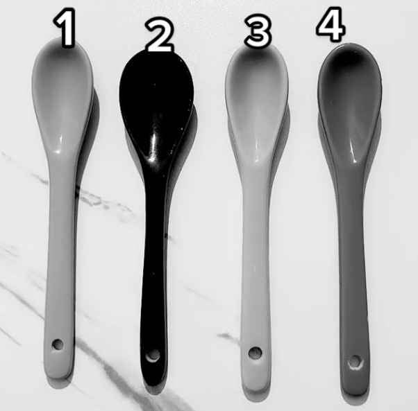 - – Lyžica č. 3: Pozadie je stredne svetlé. Lyžica má takmer identický odtieň sivej ako pozadie za ňou, takmer sa v ňom stratí. To je znak objektu, ktorého farba sa do čiernobielej škály premenila podobne ako jeho okolie.