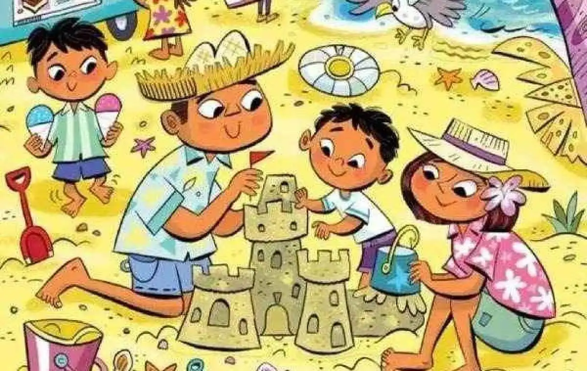 Keď sa prvýkrát pozriete, vidíte typickú pláž: rodinu, piesočný hrad, dievča so surfom, palmu. Žiadny magnet tu jasne nevidno. A práve v tom je háčik. Vaše oči sú zvyknuté vyhľadávať predmety podľa ich bežnej podoby, ale tu je magnet súčasťou obrazu, je zamaskovaný. Musíte prepnúť myšlienkové nastavenie z „hľadám predmet“ na „hľadám tvar alebo vzor, ktorý pripomína magnet“.