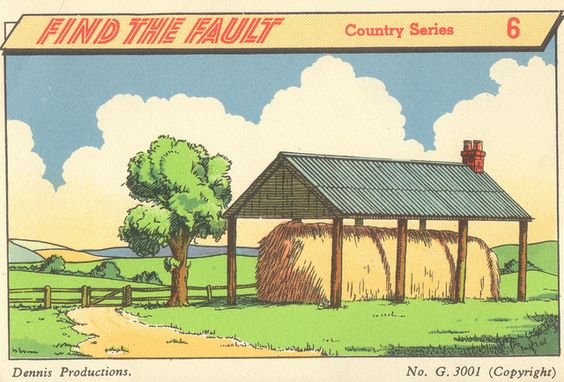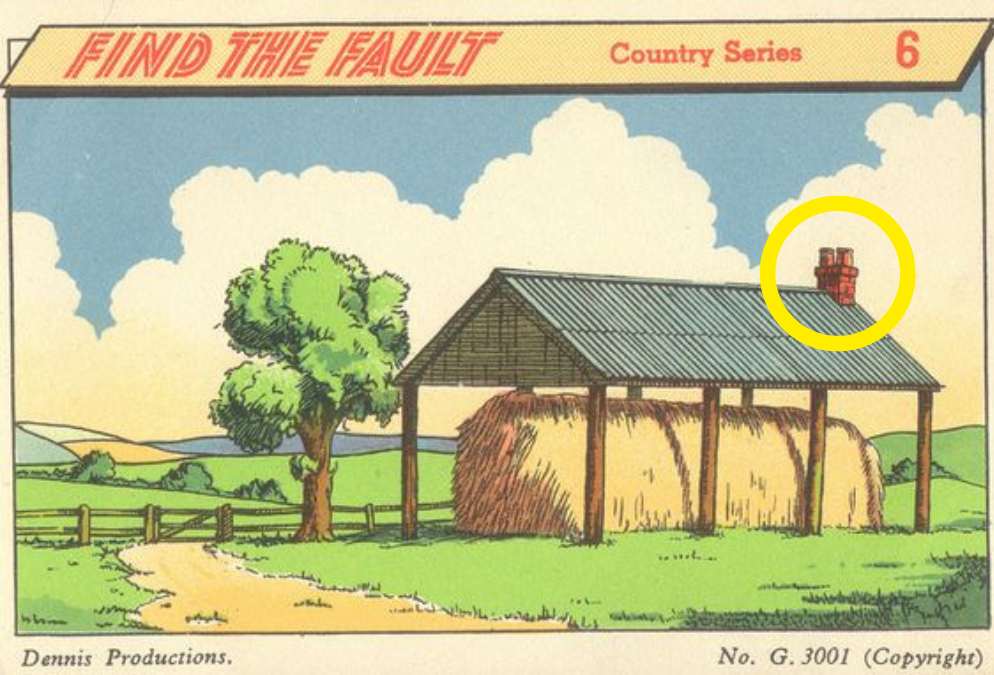 Chyba, ktorú treba nájsť, je komín na streche budovy, kde je uskladnené seno. Prečo je to chyba? Pretože takéto otvorené alebo polootvorené stavby na skladovanie sena (stodoly, seníky) nemajú kachlice ani krby. Komín je nevyhnutnou súčasťou budovy s ohniskom alebo kachľami, ktoré sa používajú na vykurovanie obytných priestorov. Uskladnené seno je vysoko horľavý materiál a stavbať oheň v jeho bezprostrednej blízkosti by bolo veľmi nebezpečné a v praxi sa to nerobí. Preto je prítomnosť komína na takejto senníckej budove logickým nedostatkom a chybou v zobrazovaní reality.