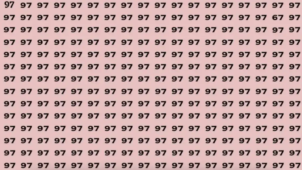Riešenie je nasledovné: Číslo 67 sa skutočne nachádza v **pravom hornom rohu** obrázka. Konkrétne je to druhé číslo sprava v druhom riadku zhora. Zatiaľ čo všetky okolité čísla jasne ukazujú „97“, toto jedno miesto má strednú číslicu zmenenú na „6“. Váš mozog, navyknutý na sled číslic 9 a 7, túto jemnú zmenu často prehliadne. Úspech závisí od schopnosti potlačiť automatické vnímanie a aktívne skenovať každý detail.