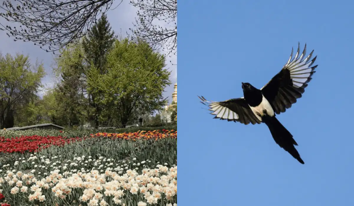 Na obrázku plnom kvetov a stromov sa skrýva vták – straka. Úlohou je nájsť ho čo najrýchlejšie. Kľúčom je nepozerať sa na každý detail, ale zamyslieť sa, kde by sa vták prirodzene mohol ukrývať.