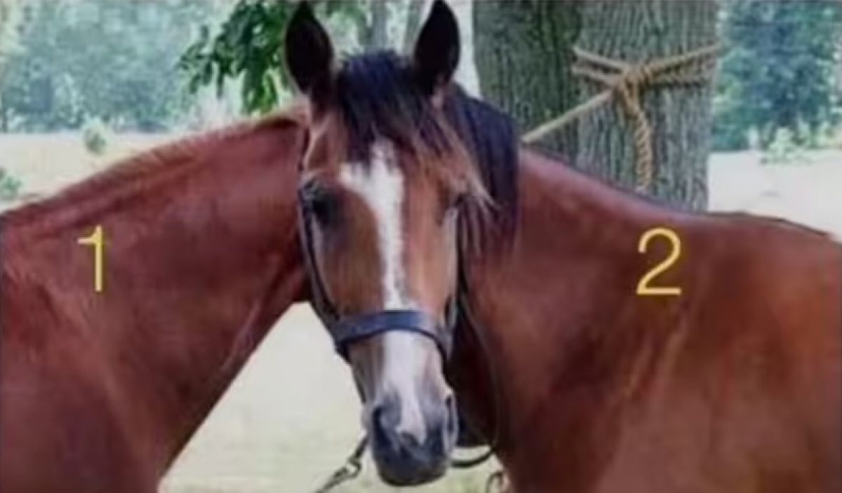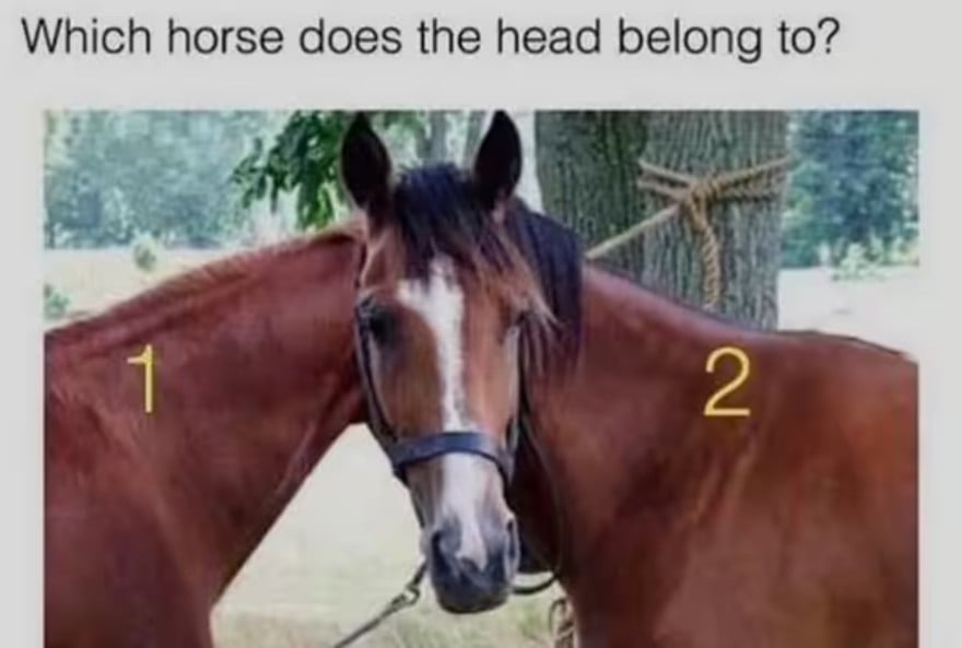 Táto optická ilúzia vás vyzýva, aby ste v spleti telies dvoch koní určili, ktoré patrí k hlave toho, čo sa pozerá priamo na vás. Kľúčom je sledovať línie a farbu, nie sa nechať zmiasť zdanlivým chaosom.