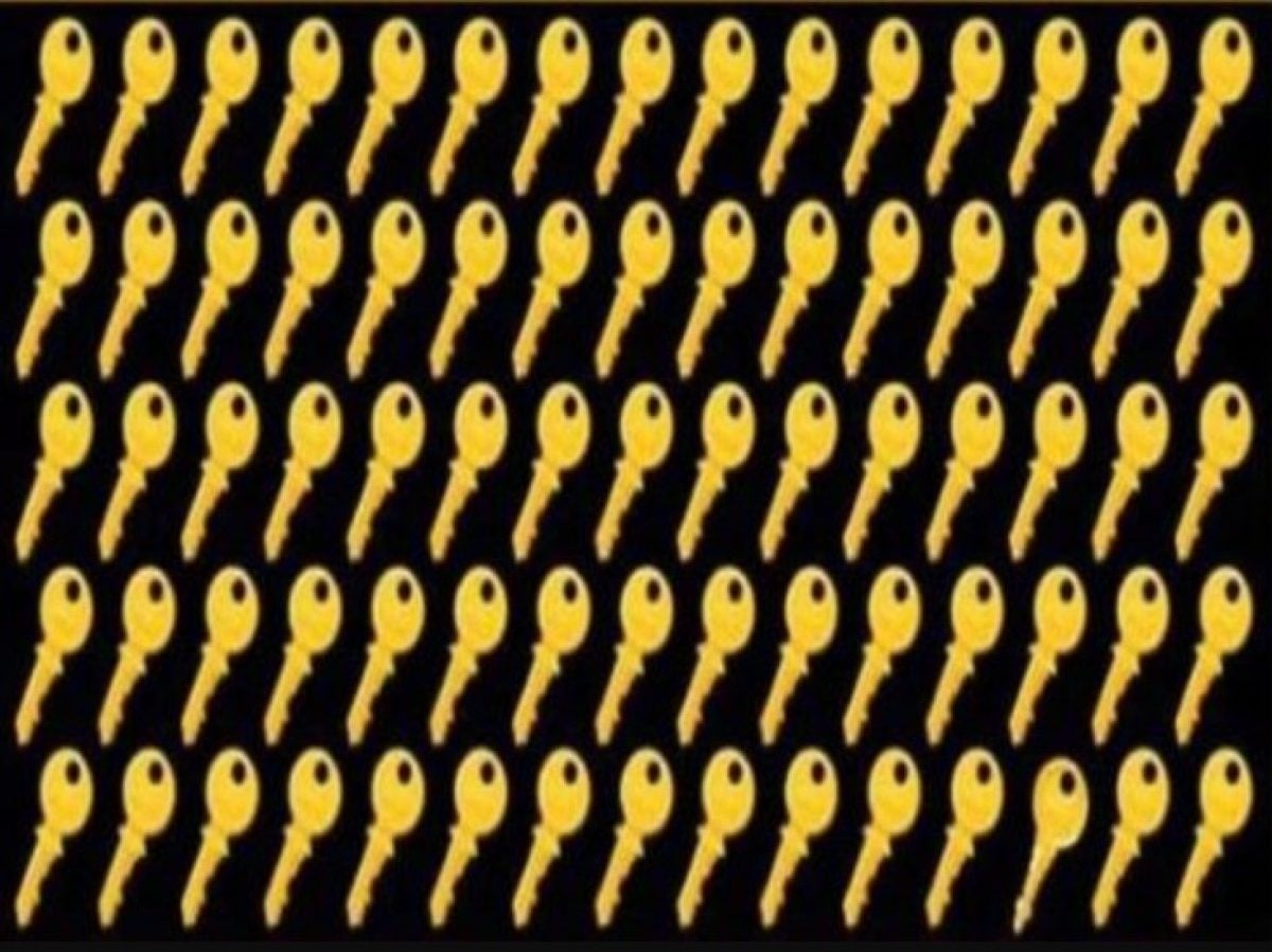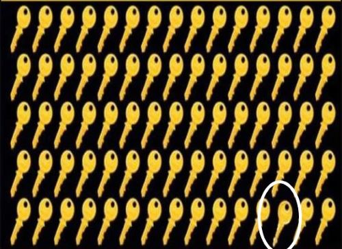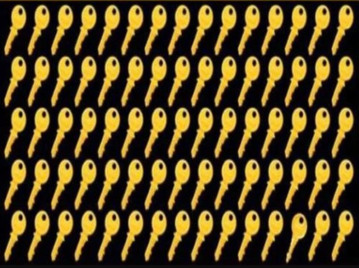 Predstavte si, že ste správcom obrovského archívu, kde sú všetky kľúče zdanlivo rovnaké. Vašou úlohou je nájsť ten jeden špeciálny, ktorý otvára tajnú komnatu. Máte na to len 11 sekúnd! Obrázok je plný kľúčov usporiadaných v radoch a všetky sa tvária, že sú bratranci. Ale jeden z nich je podvodník. Dokážete ho odhaliť skôr, ako čas vyprší? Toto nie je len test zraku, je to skúška pozornosti a rýchlosti vnímania.