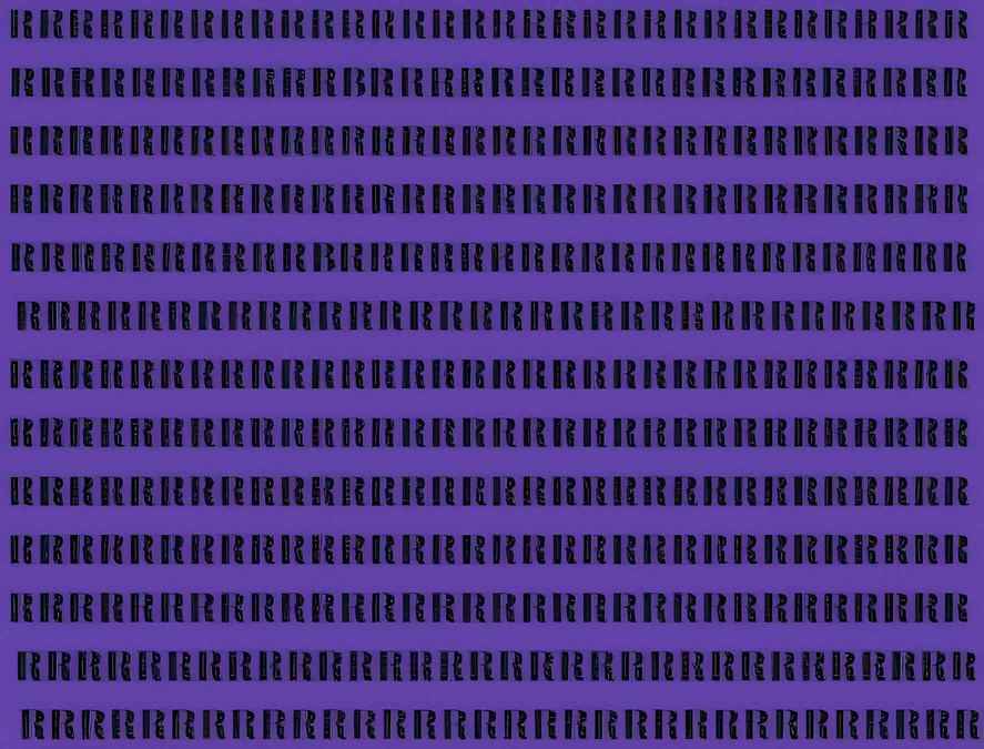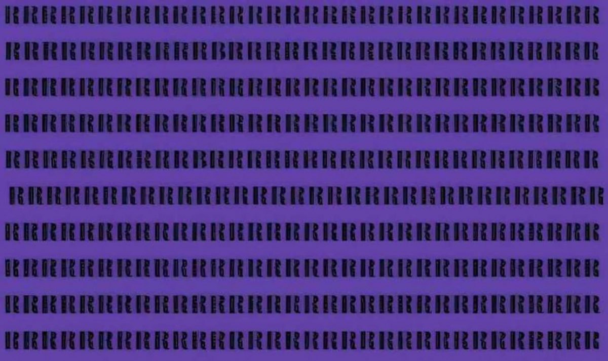 Medzi radmi písmen R sa skrývajú dve písmená B. Úlohou je nájsť ich za 9 sekúnd. Kľúčom je prelomiť vizuálny stereotyp a nepodliehať dojmu, že vidíte len jeden znak.