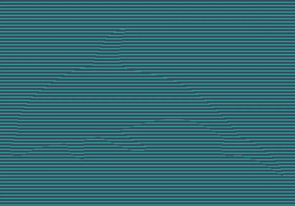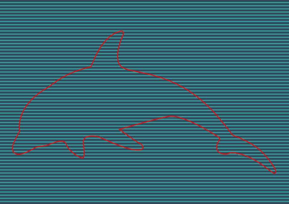 Teraz prichádza riešenie. Kľúčom je percepčný posun. Čierna časť v strede nie je telo zvieraťa, ale priestor *okolo* neho. Ak sa sústredíte na bielu oblasť vpravo, zbadáte charakteristický dlhý zobák. Biela plocha vľavo hore tvorí chrbát a plutvu. Keď si to všetko pospájate, zjaví sa vám elegantný delfín, ktorý skáče z vody alebo pláva smerom k vám. Pozrite sa na obrázok s touto novou perspektívou: