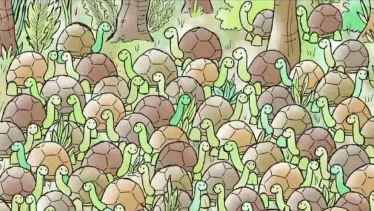 Tento optický klam vás oklame tým, že had nie je skrytý medzi korytnačkami, ale je súčasťou jednej z nich. Kľúčom je pozrieť sa na detaily, ktoré vybočujú z opakujúceho sa vzoru – konkrétne na chvosty plazov.