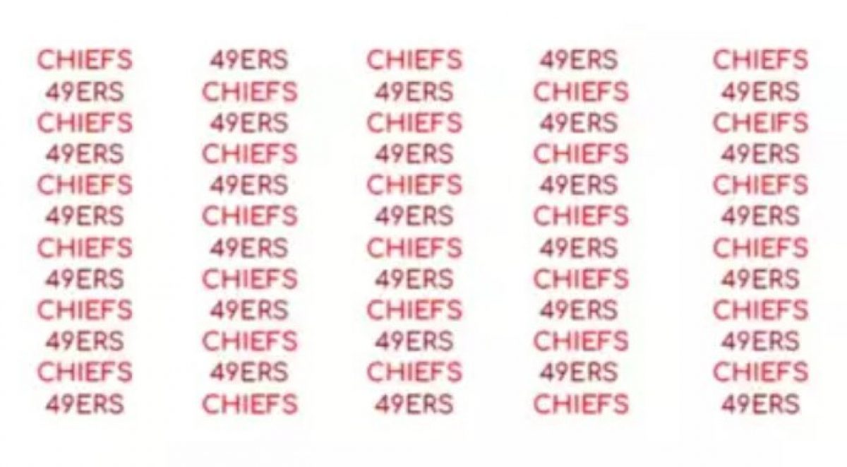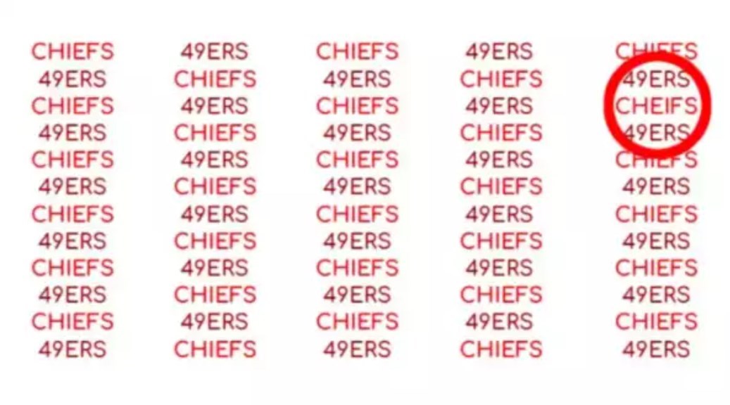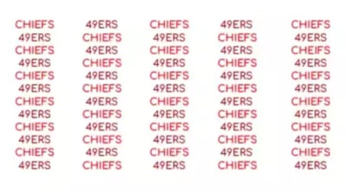 Vašou úlohou je pozrieť sa na obrázok nižšie a nájsť jediné slovo, ktoré je napísané s preklepom. Slová sú „49ERS“ a „CHIEFS“. Nemusíte rozumieť ich významu, stačí sa sústrediť na grafickú podobu a správny patrón písmen.