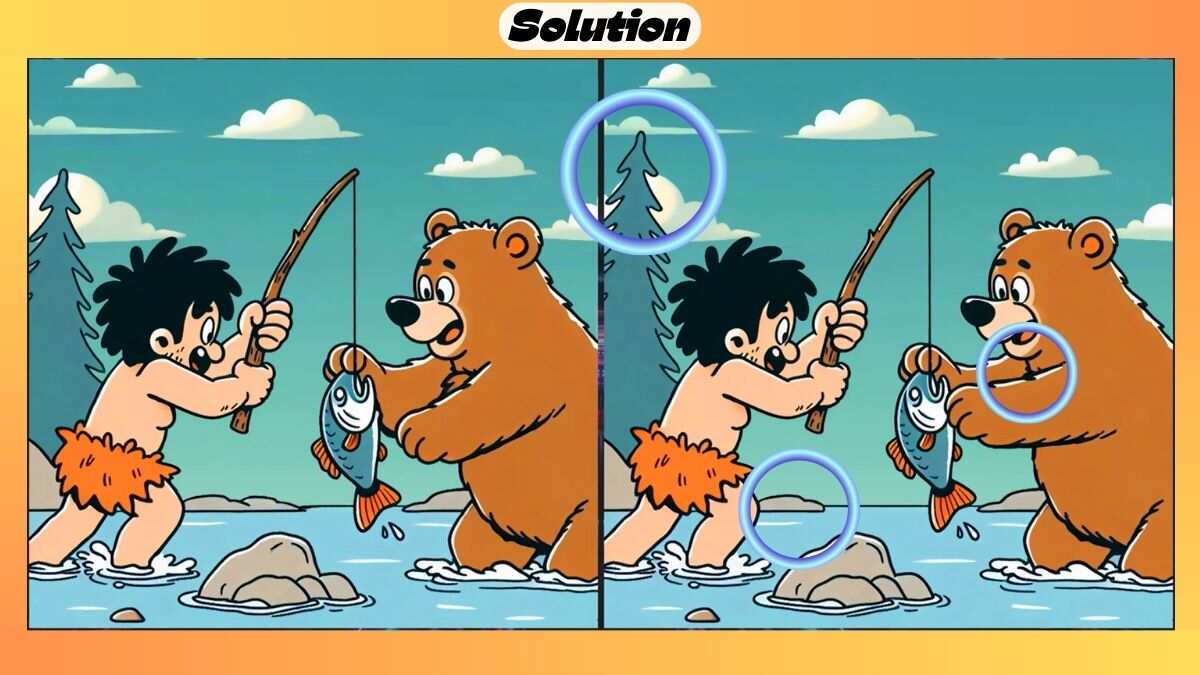 Dvaja kamaráti pri rybačke vyzerajú na obidvoch obrázkoch rovnako, ale tri detaily sa zmenili. Kľúčom k úspechu je systematické skenovanie obrazu po sekciách a porovnávanie každého prvku. Pozrite sa na tvary, farby a počet predmetov.