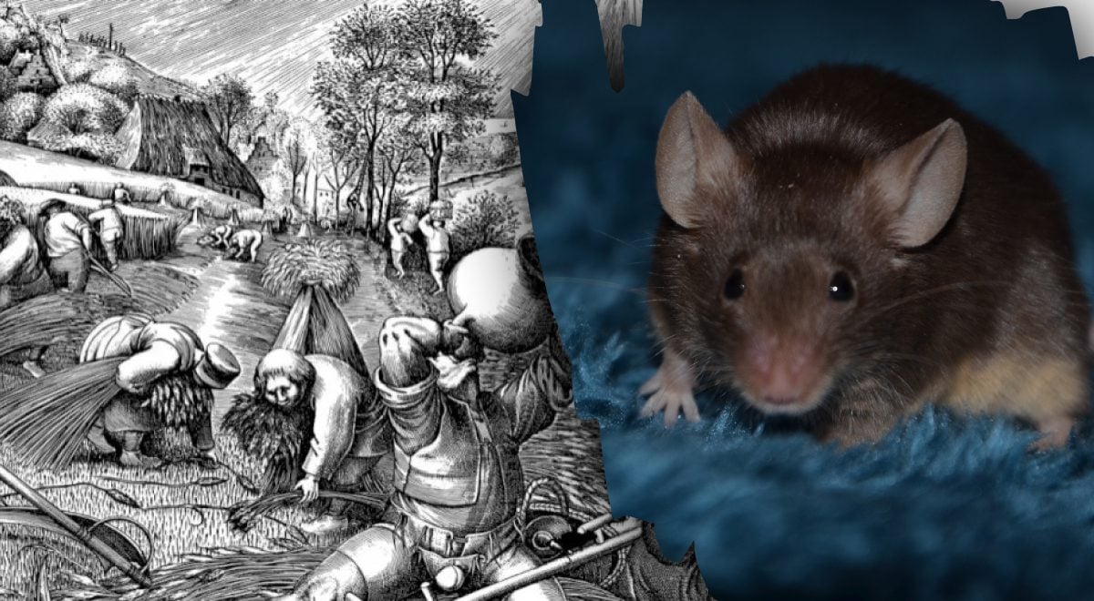 Pozrite sa na čiernobiely obrázok. Scéna je rušná, plná pohybu a detailov. Váš mozog sa bude snažiť spracovať všetko naraz, ale práve v tom je háčik. Potkan nie je súčasťou hlavného dejstva. Je to detail, ktorý vyžaduje iný prístup. Skúste namiesto sústredenia sa na postavy prejsť pohľadom po okrajoch, medzi klasmi, tam, kde sú tiene hlbšie a tvary nejasnejšie. Jeho silueta nie je dokonalá, ale je tam.