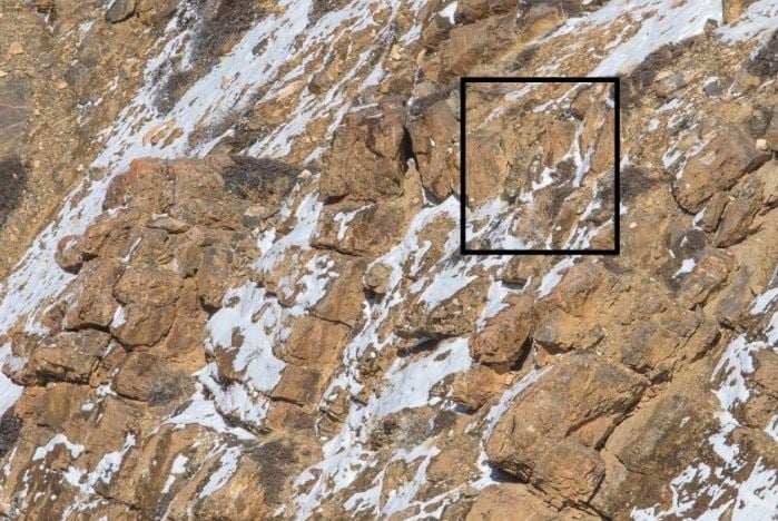 Leopard snežný je skutočným majstrom neviditeľnosti. Na tejto fotografii leží schovaný medzi skalnými blokmi. Ak ste stále stratení, pozrite sa do stredu obrázka, kúsok napravo od zvislej osi. Vidíte veľký, svetlý skalný blok s výraznými tmavými pruhmi? Priamo na ňom, v jeho hornej časti, je zviera. Jeho telo splýva so skalou, ale jeho hlava a chvost sú rozoznateľné. Hlava smeruje doľava, ucho je pritlačené, a práve vtedy, keď si všimnete to malé, tmavé oko, celý tvar sa „vynorí“ z pozadia. Je to moment „aha!“, keď sa mozog prepne a už ho nemôžete „odvidiť“.