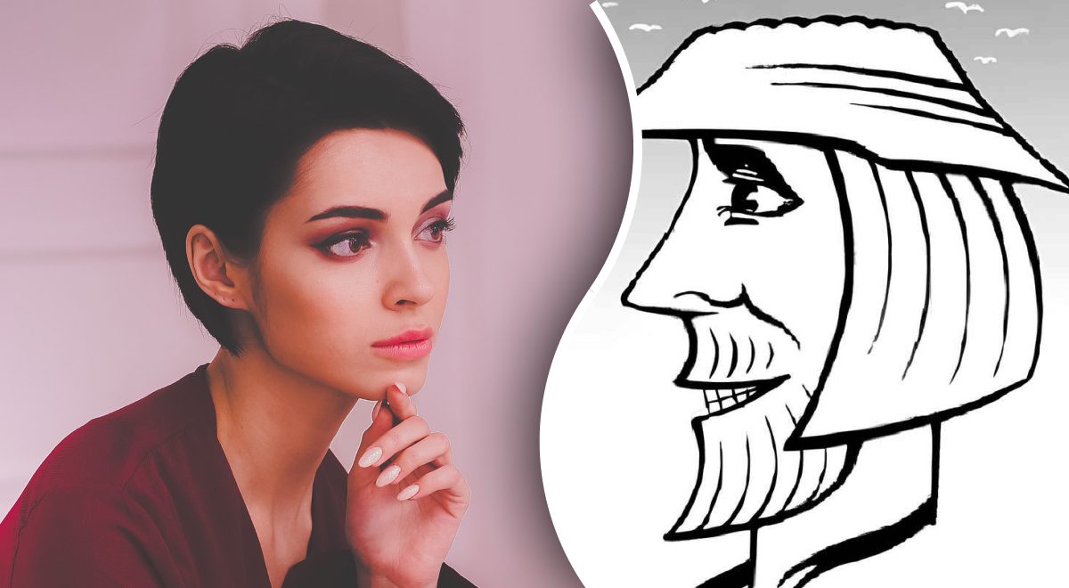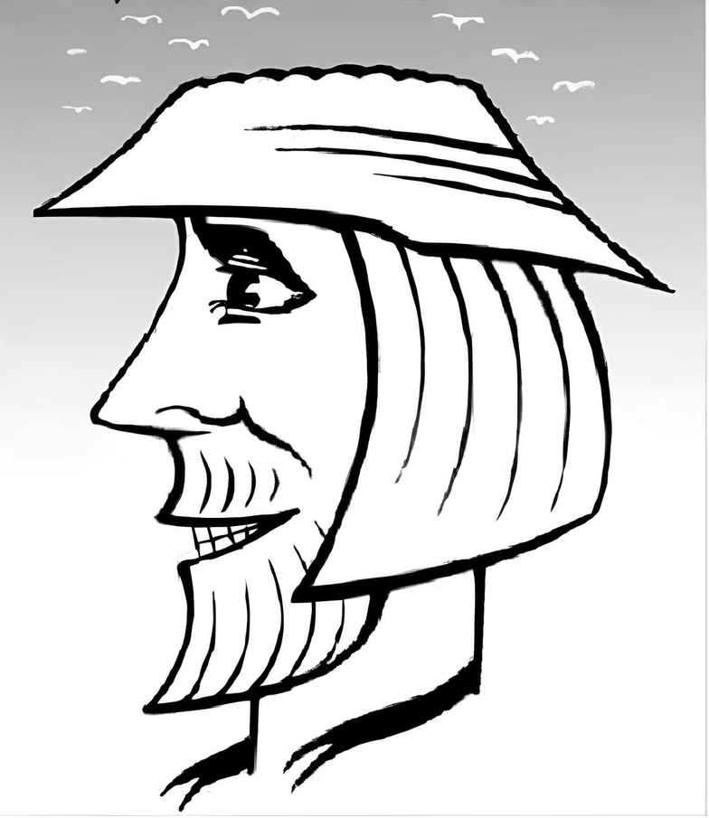 – Mužova brada a ústa sa premenia na postavu námorníka, ktorý stojí na palube a pozerá sa smerom k vám.