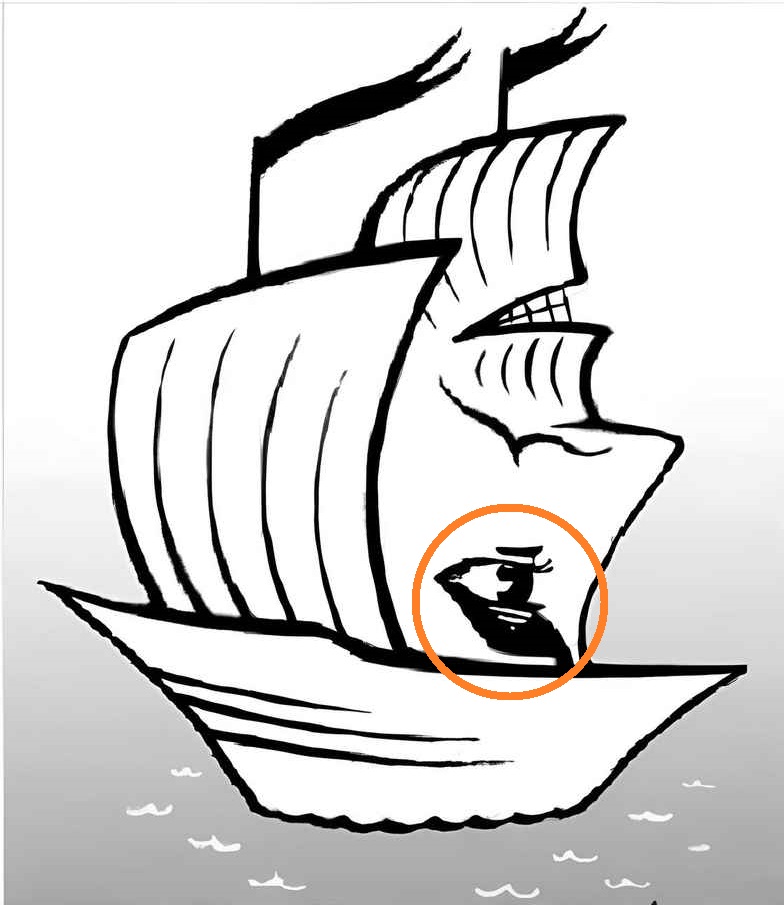 Celý obrázok je v skutočnosti kresbou lode s námorníkom, ktorá je však umelo nakreslená tak, že pri otočení o 180 stupňov vytvára presvedčivú ilúziu tváre. Váš mozog, zvyknutý rozpoznávať tváre, automaticky preferoval túto interpretáciu, keď bol obrázok v „správnej“ orientácii. Toto je krásna ukážka perceptuálnej predpojatosti.