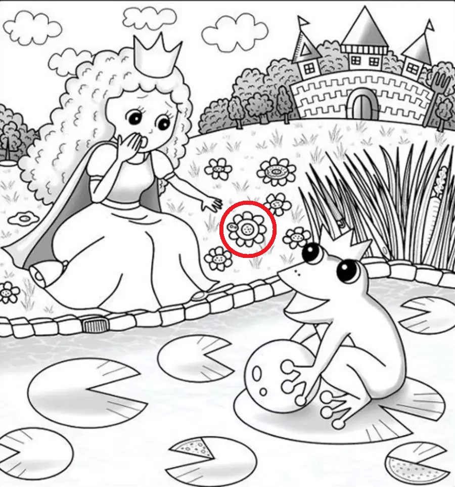 Čas na riešenie! Prsteň princeznej je skrytý priamo na veľkom kvetu, ktorý rastie v tráve hneď vedľa jej šiat. Jeho okrúhly tvar splynie s okvetnými lístkami a stredom kvetu, čo je typický príklad optickej ilúzie založenej na maskovaní. Nie je to samostatne nakreslený predmet, ale súčasť kresby kvetu, čo našu pozornosť efektívne odvádza.