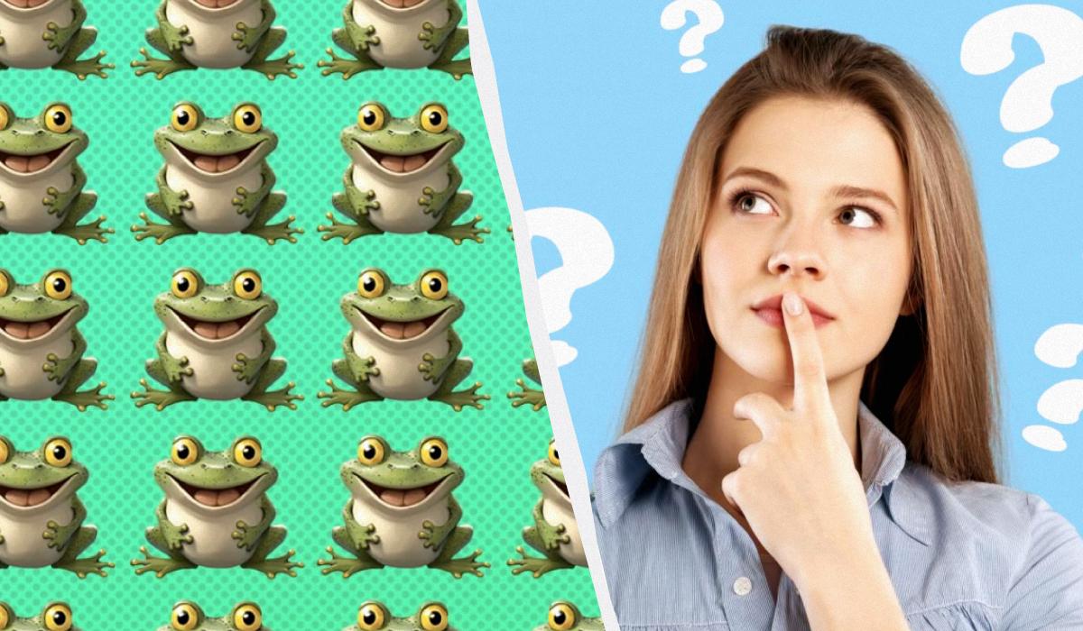 Predstavte si, že ste v laboratóriu prírody a váš úkol je rýchlo identifikovať jedinca s odlišným genetickým znakom. Na stole pred vami je fotografia s hustým zástupom 35 zelených žiabok. Všetky sedia v rovnakom uvoľnenom postoji, smerujú rovnakým smerom a usmievajú sa. Ale jedna z nich nie je úplne dokonalá kópia. Časový limit je neúprosný – iba 8 sekúnd. Dokážete pod tlakom udržať sústredenú pozornosť a nájsť tú, ktorá vybočuje?