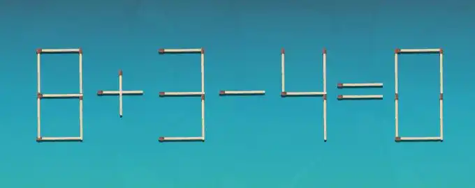 Tento zápalkový hlavolam testuje nielen vaše matematické schopnosti, ale aj priestorovú predstavivosť. Nesprávna rovnosť 8+3-4=0 sa dá opraviť presunutím