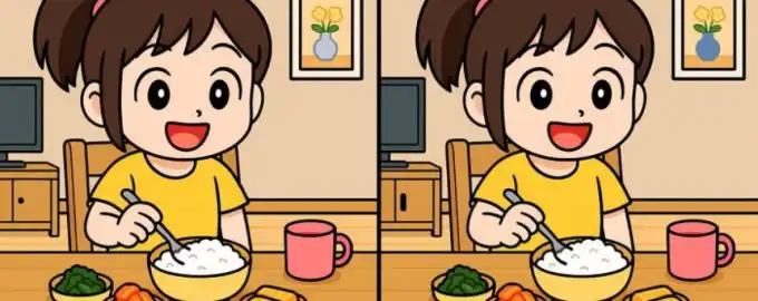 Dve zdanlivo identické scény dievčaťa pri stole skrývajú tri jemné rozdiely. Dokážete ich všetky odhaliť za 49 sekúnd? Kľúčom je systematické skenovanie