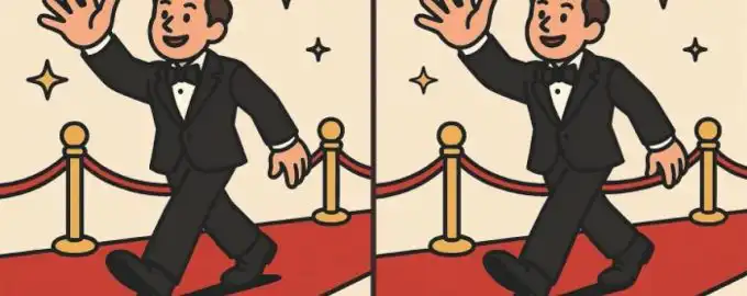 Dokážete nájsť tri malé rozdiely medzi dvoma obrázkami muža v obleku na červenom koberci? Táto klasická hádanka testuje vašu pozornosť a rýchlosť vnímania.